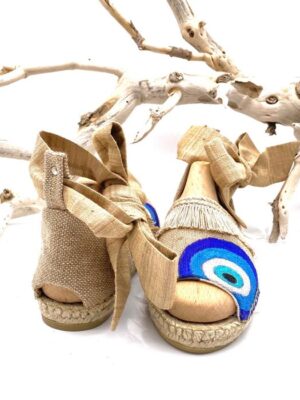 Γυναικείες χειροποίητες , μοναδικές, φλατ εσπαντρίγιες σε νούμερο 37. Κατασκευασμένα εξ ολοκλήρου χειροποίητα. Συναρμολογημένες με χειροραφή με κηροκλωστή. Αυθεντικός ισπανικός πάτος. Μπροστινό κομμάτι ραμμένο από λινάτσα αρίστης ποιότητας με ζωγραφισμένο στο χέρι “μάτι” και επιπλέων στολισμένο με μια όμορφη τρέσα με κρόσι. Εσωτερικά βαμβακερή φόδρα. Πίσω στην φτέρνα μεταξωτή κορδέλα για δέσιμο στο αστράγαλο. Είναι ένας τέλειος συνδυασμός άνεσης και ποιότητας. Σχεδιασμένο και δημιουργημένο με πολύ μεράκι . Η σόλα είναι κατασκευασμένη από αντιολισθητικό λάστιχο. Ιδανικό για στυλάτες εμφανίσεις όλες τις ώρες της ημέρας. Όλα τα υλικά που χρησιμοποιηθήκαν είναι eco. Μια επιλογή για εσάς που έχετε την οικολογική συνείδηση. Δυνατότητα παραγγελίας για άλλο μέγεθος