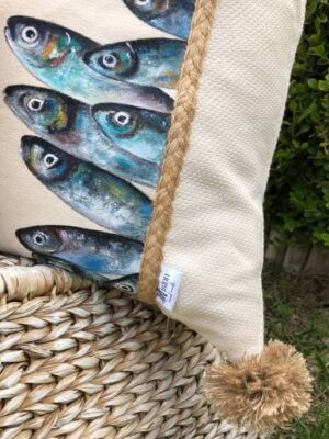 Μια μοναδική, διακοσμητική, βαμβακερή θήκη μαξιλαριού με ζωγραφισμένες σαρδέλες, που θα στολίσει τον καναπέ ή το κρεβάτι σας και θα δώσει ένα ξεχωριστό στυλ στο χώρο σας!