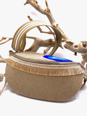 Μοναδικό ,χειροποίητο τσανάκι για την μέση και τον ώμο. Ραμμένο από λινάτσα αρίστης ποιότητας με ζωγραφισμένο στο χέρι “μάτι” και επιπλέων στολισμένο με μια όμορφη τρέσα με κρόσι. Κλείνει με φερμουάρ. Εσωτερικά βαμβακερή φόδρα και εσωτερική τσέπη που επίσης κλείνει με φερμουάρ. Είναι ένας τέλειος συνδυασμός άνεσης και ποιότητας. Σχεδιασμένο και δημιουργημένο με πολύ μεράκι .Ιδανικό για στυλάτες εμφανίσεις όλες τις ώρες της ημέρας. Όλα τα υλικά που χρησιμοποιηθήκαν είναι eco. Μια επιλογή για εσάς που έχετε την οικολογική συνείδηση.