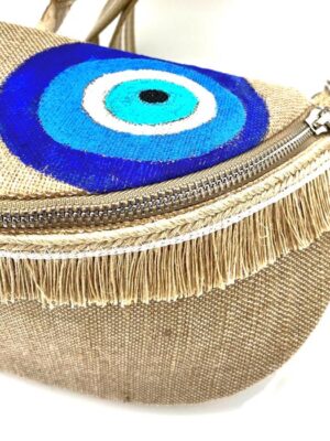 Μοναδικό, χειροποίητο τσανάκι για την μέση και τον ώμο από λινάτσα με ζωγραφισμένο “μάτι”.